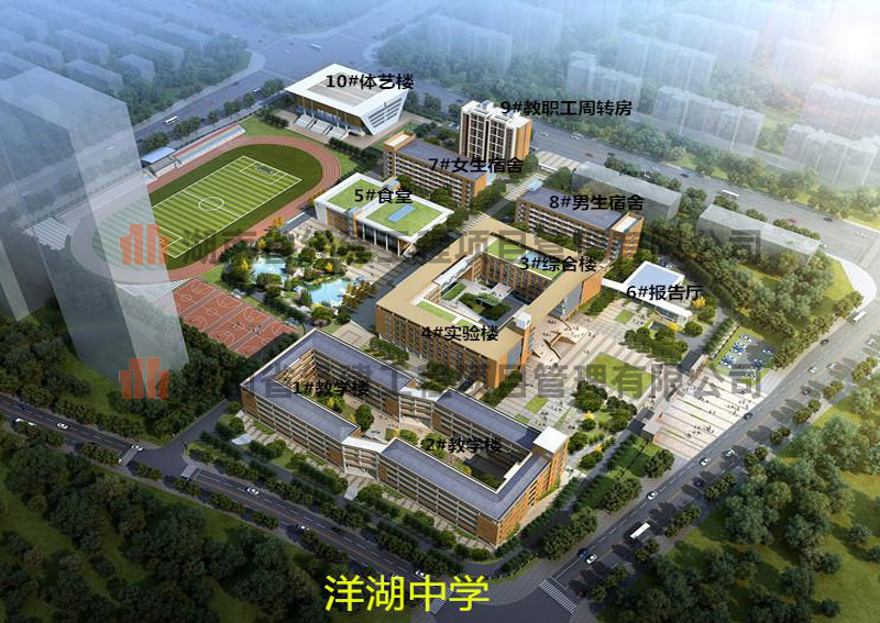 長沙縣洋湖中學為整體新建項目,辦學規模為48個班的普通高中,學校總用地面積124602平方米,總建筑面積69960平方米,總投資20673.74萬元。